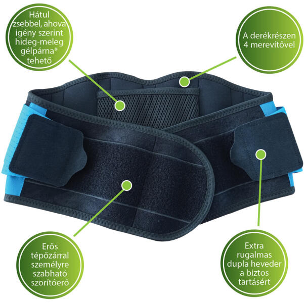 A derék hátsó részén egy zseb került kialakításra, ahova hideg-meleg gélpárna helyezhető a hatás fokozása érdekében. (A gélpárna nem tartozik, de kínálatunkból is megvásárolhatja: hideg-meleg gélpárnák)
