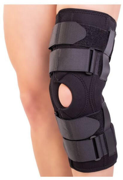 A térdízület oldalirányú instabilitása, a térdízület trauma és sérülések, gyulladásos folyamatok, posztoperatív helyreállítás esetén alkalmazzák. Ortézis textilanyagból, előzőleg felbontva, a következőkkel felszerelve: 2 fém sín mozgatható csatlakozással, egy-egy mindkét oldalon 2 rögzítőcsík combmagasságú tüskékkel 2 rögzítőcsík csapokkal, vádli magasságban. A patella nyílásának szintjén az anyag átfedésben van, és az ortézis bezárása után körkörös patelláris tartó jön létre. Hosszúság: 38 cm. Alakjának köszönhetően az ortézis olyan térdre használható, amelynek anatómiai megkönnyebbülése deformálódik, azzal a lehetőséggel, hogy a tömörítést az előző zárási móddal és a 4 rögzítőszalaggal állítsa be. Mérjük meg a térd kerületét a patella közepén     M1             M2             M3             M4              M5             M6             M7              M8  33-35 35-37 37-39 39-41 41-43 43-45 45-47 47-49